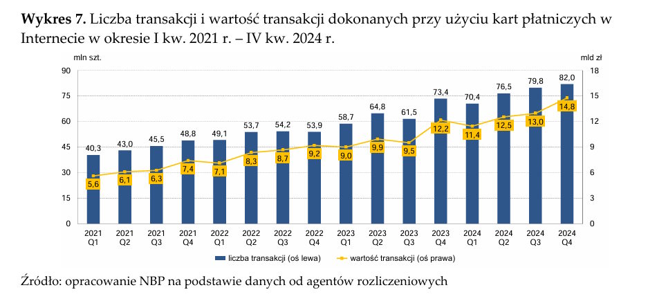 Wraz z liczbą i wartością płatności kartami w internecie zwiększa się również ich udział w bezgotówkowych transakcjach tymi instrumentami. W 2024 płatności kartami w internecie stanowiły 3,1 proc. operacji bezgotówkowych plastikami (rok wcześniej - 2,8 proc.) oraz 7,5 proc. ich wartości (wzrost z 6,5 proc.).
