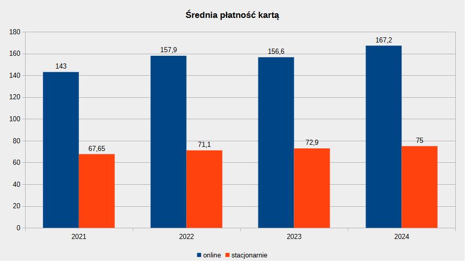 Dla porównania pojedyncza transakcja plastikiem w sklepach naziemnych opiewa na przeszło dwukrotnie mniejszą kwotę niż online. W 2024 było to średnio 75 zł, a w poprzednim 12-miesięcznym okresie - niespełna 73 zł.