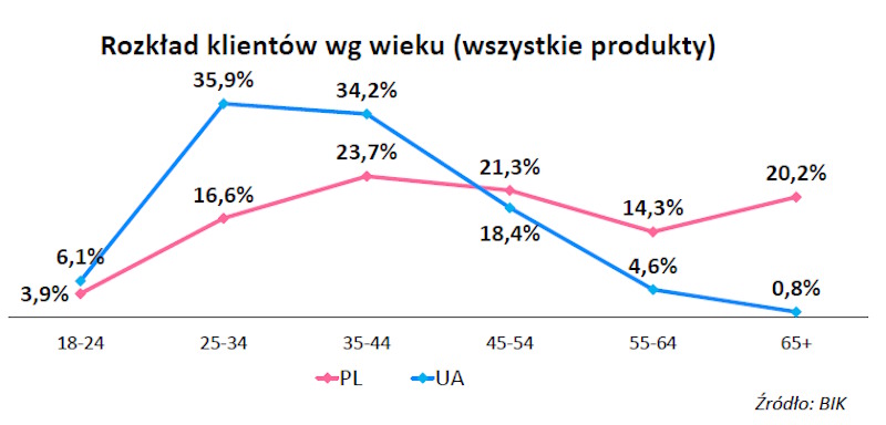 Interesująco wypada rozkład kredytobiorców z Ukrainy wg wieku na tle tych polskich. W młodszych grupach (do 44. roku życia) przeważają osoby zza wschodniej granicy - większy ich odsetek ma jakieś zobowiązanie finansowe. Natomiast w starszych grupach (powyżej 45 lat) przeważają Polacy. Innymi słowy: wśród Ukraińców bardziej zadłuża się młodsza część populacji, a wśród Polaków - ta w średnim i starszym wieku.