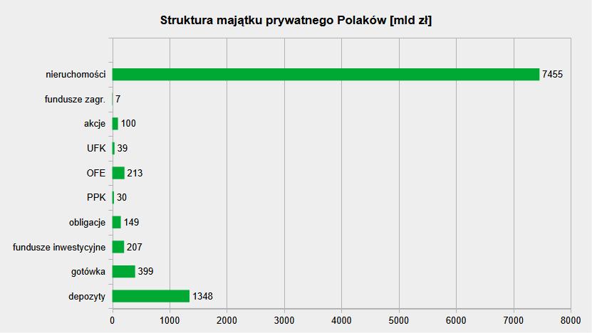 Jaka jest struktura naszego bogactwa? W największej części są to nieruchomości. Wartość domów i mieszkań należących do prywatnych osób szacuje się łącznie na 7,45 bln zł.