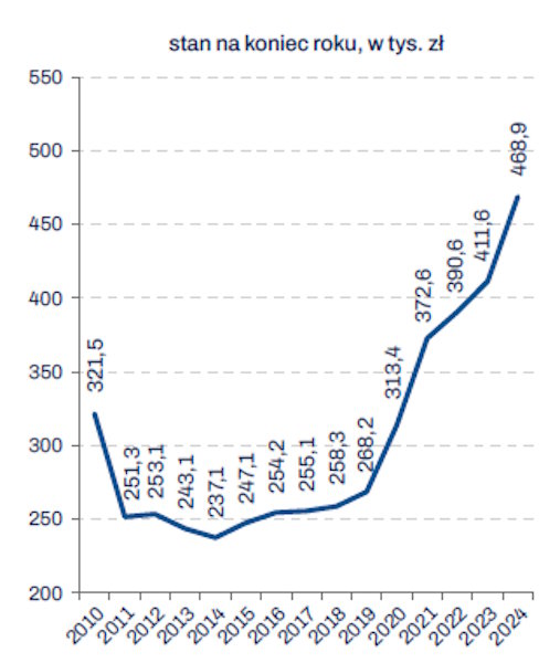 Statystycznie każde z mieszkań administrowanych przez fundusz hipoteczny było w 2024 warte 468,9 tys. zł. To o 14 proc. (57,3 tys. zł) więcej niż rok wcześniej. Od początku pandemii jego wycena wzrosła o połowę (z 313,4 tys. zł).