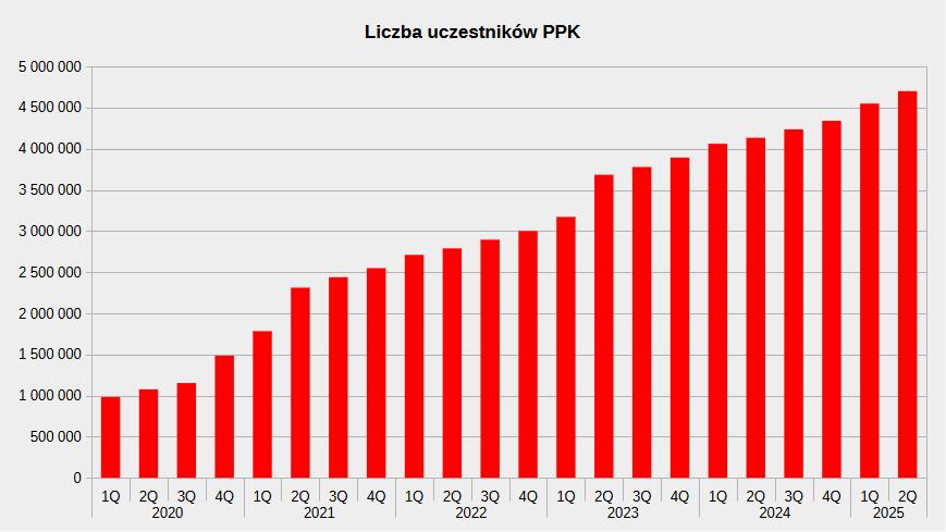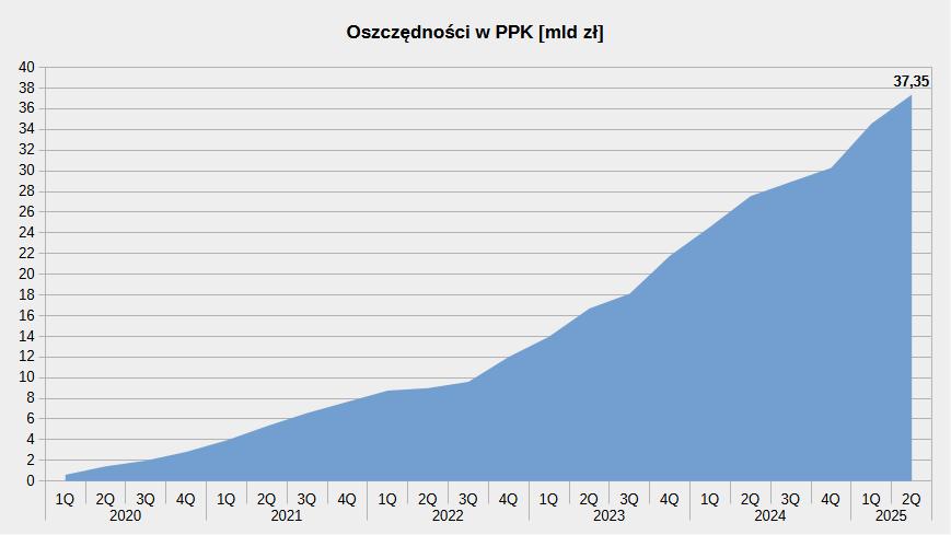 Na koniec maja 2025 wartość aktywów PPK sięgnęła 37,35 mld zł, rosnąc przez 12 miesięcy o 41 proc. (10,88 mld zł). Zatem na jednego uczestnika przypadało statystycznie 9676 zł. Przez rok jego oszczędności zwiększyły się o przeszło 1/4 (z 7563 zł).
