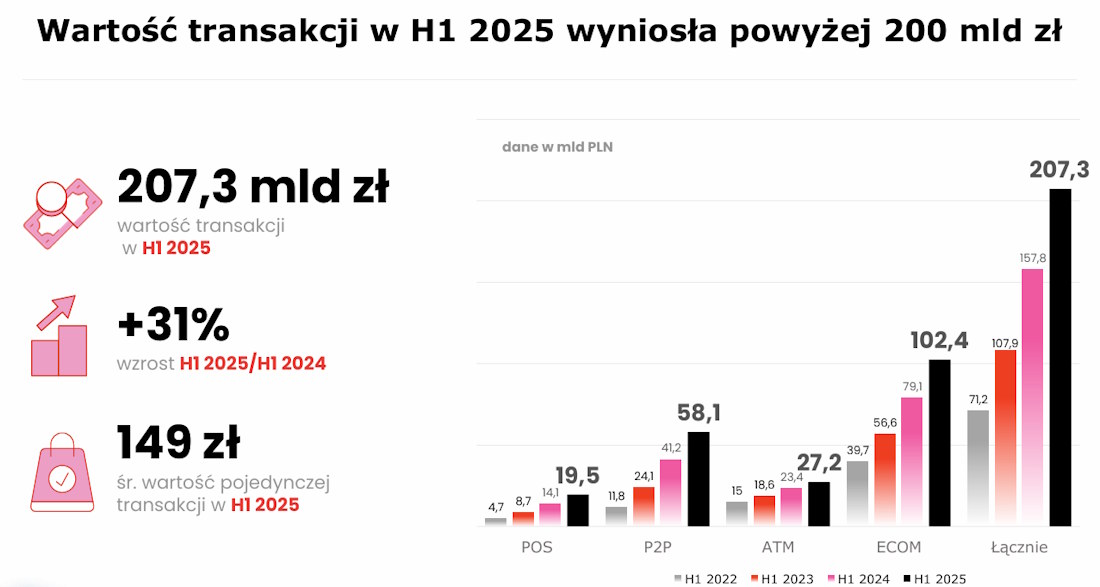 W I połowie 2025 użytkownicy Blika wykonali prawie 1,4 mld transakcji, których łączna wartość przekroczyła 207 mld zł. W stosunku do tego samego okresu rok wcześniej liczba operacji zwiększyła się o 1/4, a wydane w ten sposób środki - o 1/3. Pojedyncza transakcja opiewała na 149 zł, aczkolwiek mocno różniła się w zależności od kanału.