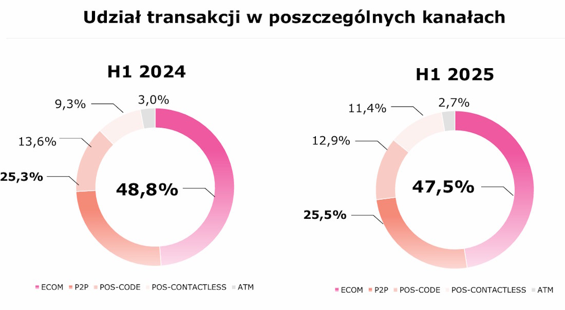 Jednak najbardziej rośnie popularność płatności zbliżeniowych. W okresie od stycznia do końca czerwca 2025 liczba takich transakcji zwiększyła się o 46 proc., a ich wartość - o 59 proc. Blik C (contactless) stanowi już prawie połowę (47 proc.) operacji w terminalach POS. Udział tego kanału rośnie.
