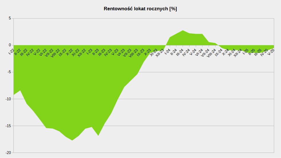 Wg ostatnich danych (maj 2025) rentowność lokat bankowych wyniosła -0,53 proc. Na ujemnym poziomie utrzymuje się od września 2024. Wcześniej też raczej pozostawała poniżej zera.