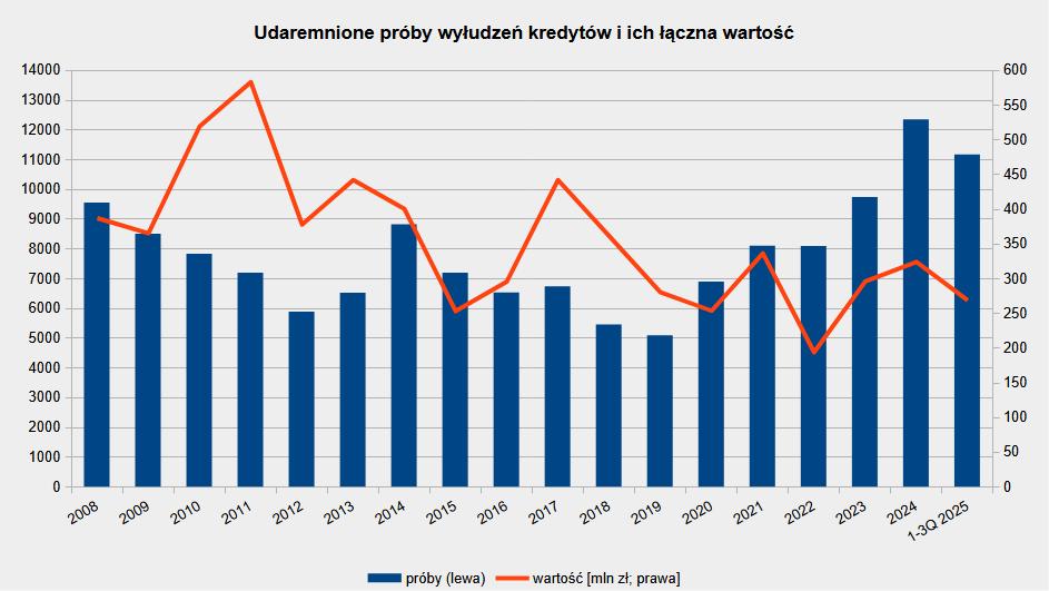 Wg danych ZBP w ciągu pierwszych trzech kwartałów 2025 przestępcy co najmniej 11.162 razy usiłowali zaciągnąć kredyt na kogoś. Prawdopodobnie tych prób było więcej, ale właśnie tyle wykryto.