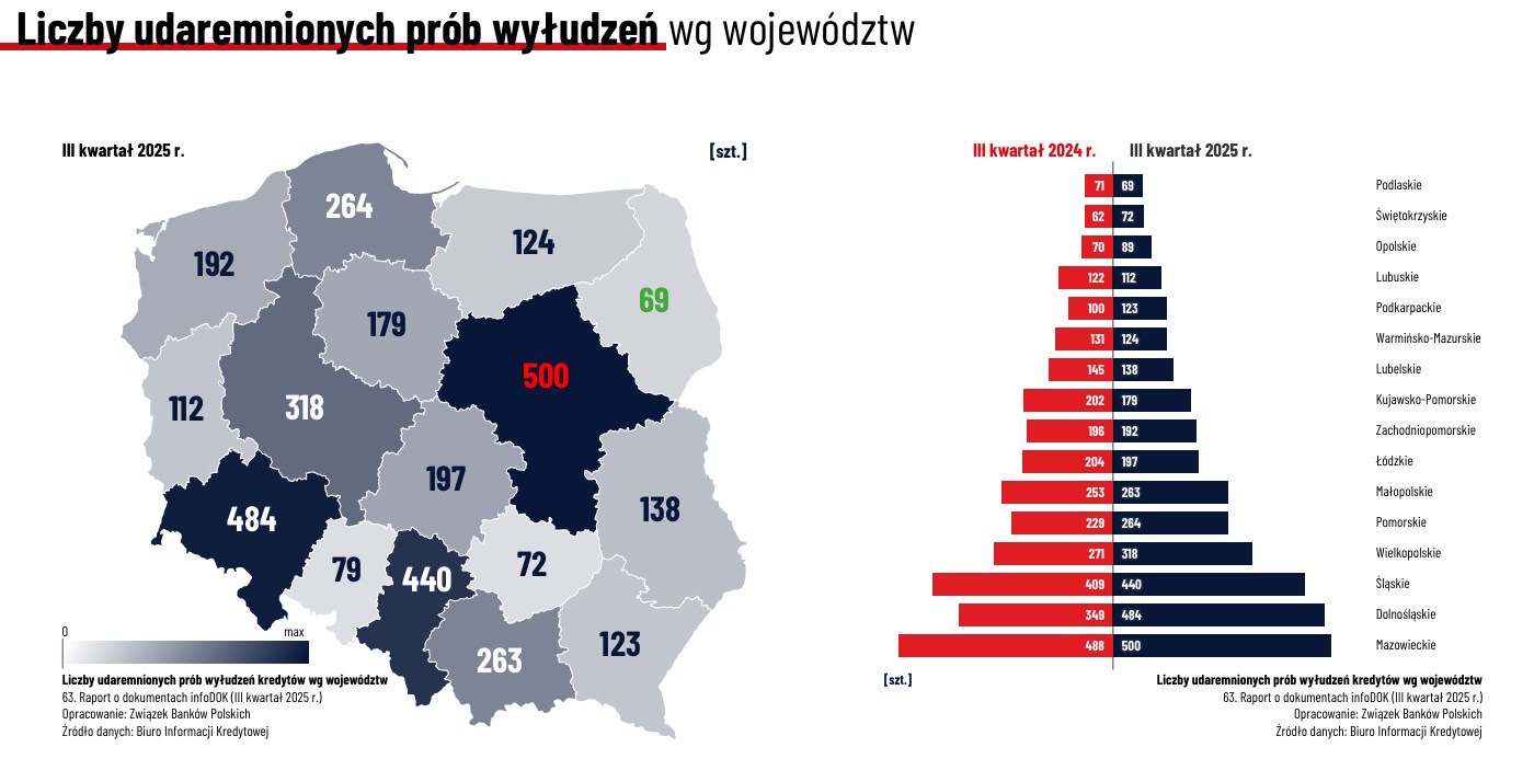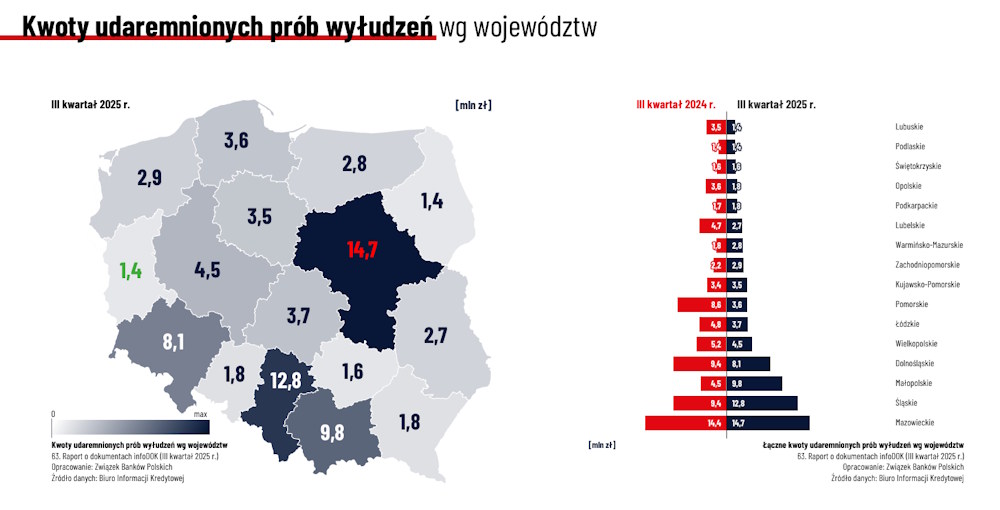 Jednak poziom aktywności złodziei w poszczególnych regionach się zmienia. W III kwartale 2025 liczba oszustw zwiększyła się w dziewięciu województwach (najbardziej: na Dolnym Śląsku - o 39 proc.), a zmalała w siedmiu (najbardziej: w woj. kujawsko-pomorskim - o 11 proc.). Natomiast skumulowana kwota wyłudzeń wzrosła w siedmiu regionach (najbardziej: w Małopolsce - o 118 proc.), w siedmiu się zmniejszyła (najbardziej: w woj. lubuskim - o 60 proc.). W dwóch pozostała na poziomie sprzed roku.