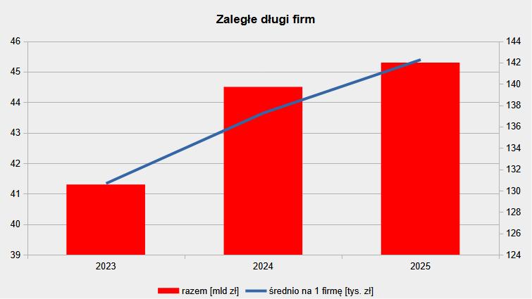 Wg danych Biura Informacji Gospodarczej InfoMonitor na koniec czerwca br. zaległe długi firm wynosiły 45,3 mld zł. To o 0,8 mld zł, czyli niespełna 2 proc., w stosunku do połowy 2024.